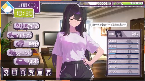 平日的行动从星期一到星期五的 18 点开始,周末则从早上 10 点开始。每天都需要在固定的时段内安排行动,通过选项与义妹对话提高好感、锻炼、打工、教她学习,以及点击义妹立绘进行身体接触。