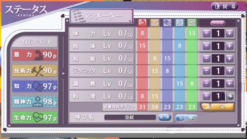 自主训练(自主トレ)可以消耗体力获得技能点数,再从状态画面中进行分配,用来提升各种能力。升级至少需要 15 点、8 点,例如升级体力需要 15 点生命力、8 点筋力。而且每提升 10 级所需的点数还会增加,比如体力从 11 级升到 20 级需要 20 点生命力、11 点筋力。