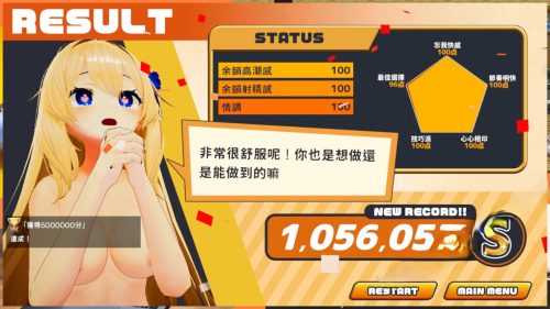 触摸流程就是一次H,可在短时间内完成,每次约两分钟左右。通过累计游戏次数,可以逐步解锁各种提示与功能,例如一开始不会显示的「射精感」、「高潮」、「情绪」与「COMBO数」等。