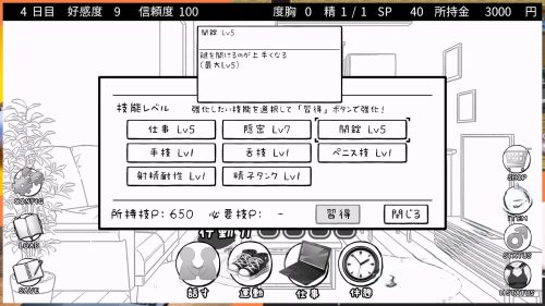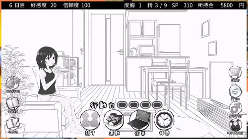 游戏中每天拥有四点行动力,可用于「交谈」「运动」「工作」等行为。