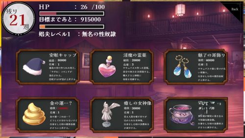 赚到的钱除了用于赎身之外,还可以在商店购买道具,主要效果是增加被嫖时获得的金钱,以及减少被嫖时消耗的体力。