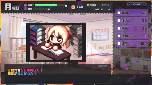 游戏方面是使用指令决定女主每天的活动,「特训」指令可以提高属性,但如果在行动力低下的情况下特训,就有机会受伤并且让属性下降,所以在进行特训时需要注意左上写的受伤机率。