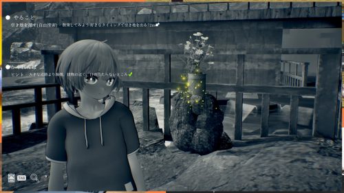 通過橋之後的右手邊有一個水桶裡快要枯萎的花(枯れかけた花)。