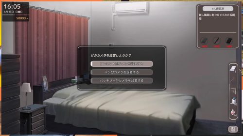 偷拍「2F 廁所」取得間男影像。(應該隨便時段放個半小時再回收就可以了,獲得「企みの証拠」)